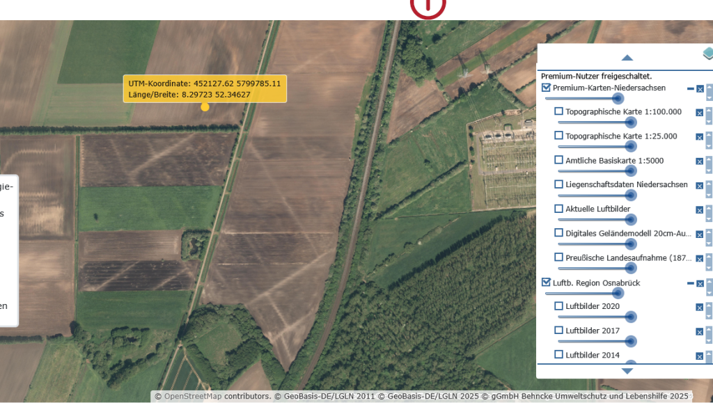 Nicht alles was man auf Luftbildern findet muss man hektisch in die Karte eintragen. Man kann auch erstmal versuchen, den Landwirt zu kontaktieren, um eine Eigenbegehung zu starten (um dann, im Falle von Funden, den Kreisarchäologen/die Kreisarchäologin zu kontaktieren). Insbesondere bei solch interessanten Mustern. Kleiner Tipp: Irgendwo im Nirgendwo im Landkreis Osnabrück.