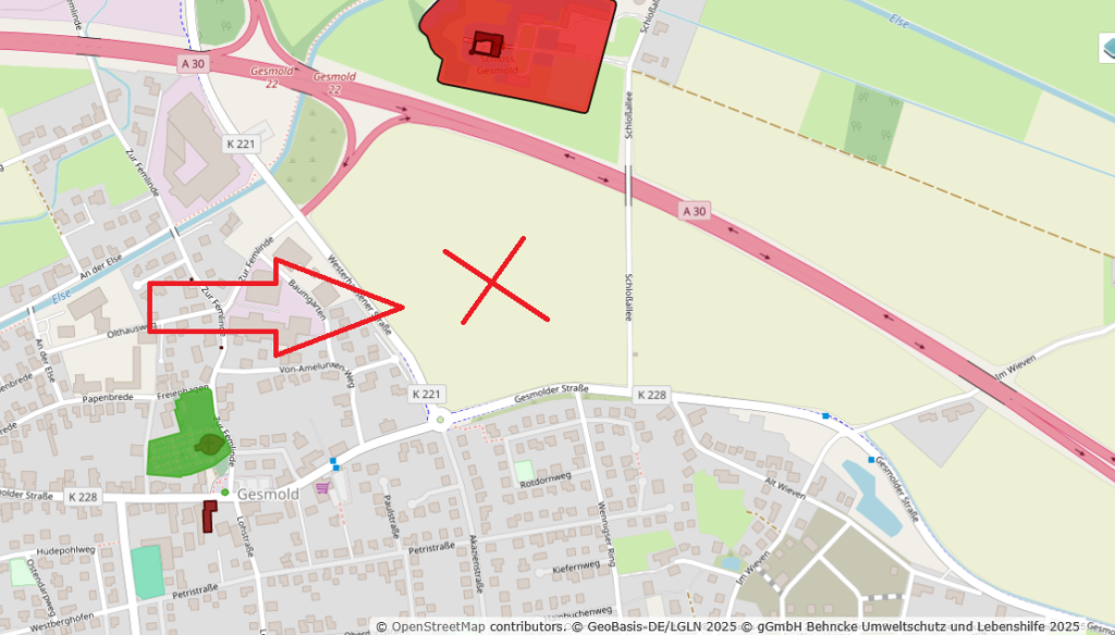 In Melle/Gesmold, unweit des „Schlosses Gesmold“ und unweit der historischen Kirche sowie der Areale, auf welchen seit einigen Hundert Jahren das dortige jährliche Volksfest stattfindet, liegt ein großes Feld (in der Nähe der Autobahn):