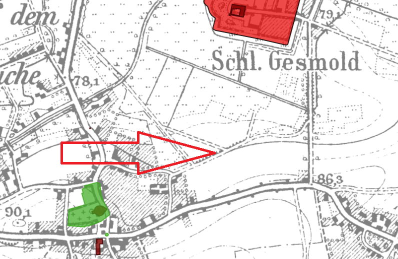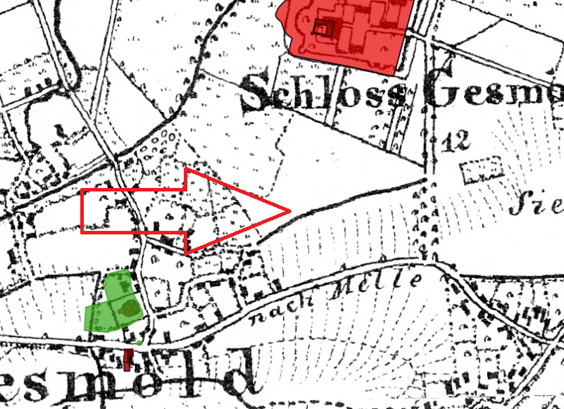Nutzt man nun die historische Karte der „Osnabrücker Landdrostei“ (erstellt vor knapp 200 Jahren) (Quelle: © GeoBasis-DE/LGLN 2025, verändert durch gGmbH Behncke Umweltschutz und Lebenshilfe 2025) so wird deutlich, dass in direkter Nähe der Areale der „Gesmolder Kirmes“ einstmals ein Weg durchführte (Beispiele dieser Art sind durch die alten Karten alleine im Landkreis Osnabrück in kaum zählbarer Vielzahl zu finden):