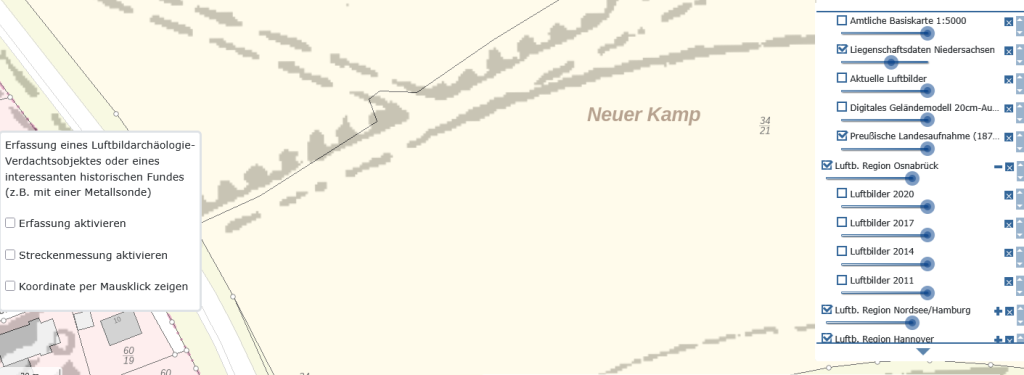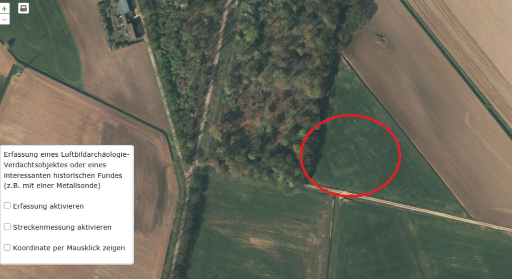 Durch die visuelle Luftbildinterpretation am heimischen PC können auf Basis unterschiedlicher Kartenebenen mutmaßlich historische Strukturen identifiziert werden. Empfohlen wird diesbezüglich ein sehr guter Vortrag („Luftbildarchäologie in Sachsen“): https://www.youtube.com/watch?v=E5XgTOYLho4