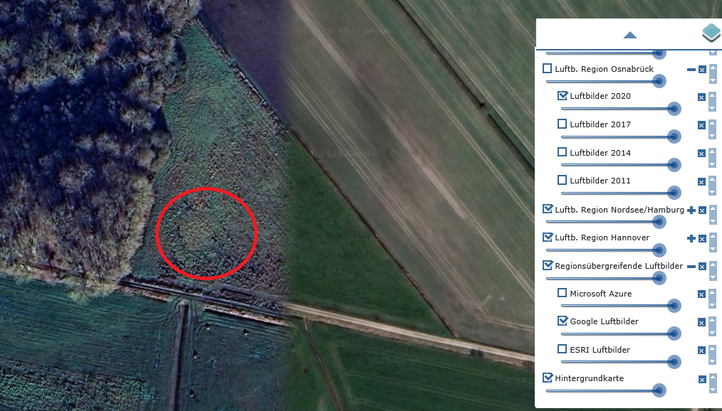 Interessant dabei ist: Die im Portal integrierten Luftbilder der LGLN aus den Jahren 2014 und 2017 zeigen diese Strukturen nicht/kaum, die Luftbilder aus dem Jahre 2020 jedoch sehr stark (Quelle: Luftbild GeoBasis-DE/LGLN 2020):