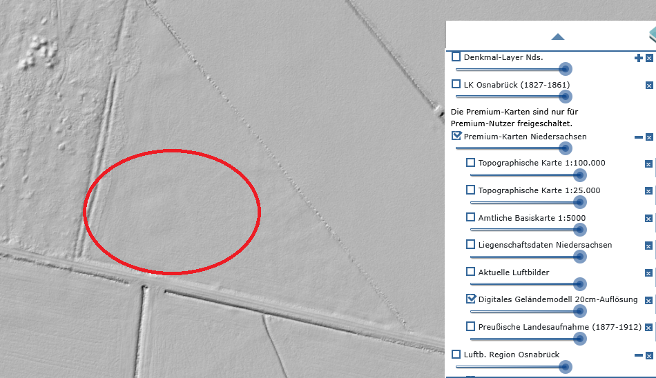 Im Höhenmodell (Karte für Premium-Nutzer) lassen sich sogar noch (recht klar) Höhendifferenzen erspähen (© GeoBasis-DE/LGLN 2025):